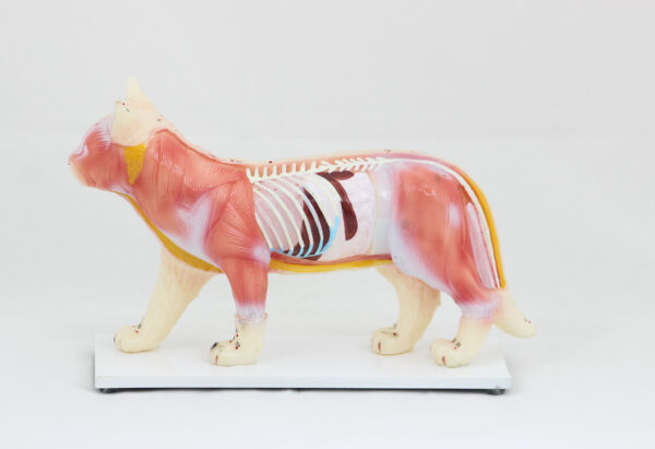 Confeccionado em PVC emborrachado, mostra 36 pontos de acupuntura do lado esquerdo do corpo do gato marcado com números.
